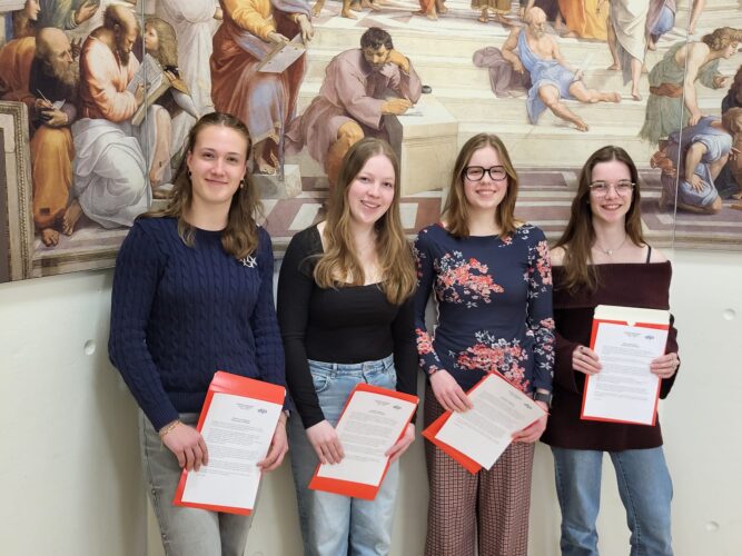 Bente, Florien, Marlijn en Floortje, allen uit klas 6, hebben hun afrondende gesprekken gehad over hun Honoursprogramma (HPG) en hebben het Honourscertificaat in ontvangst genomen. Gefeliciteerd allemaal!