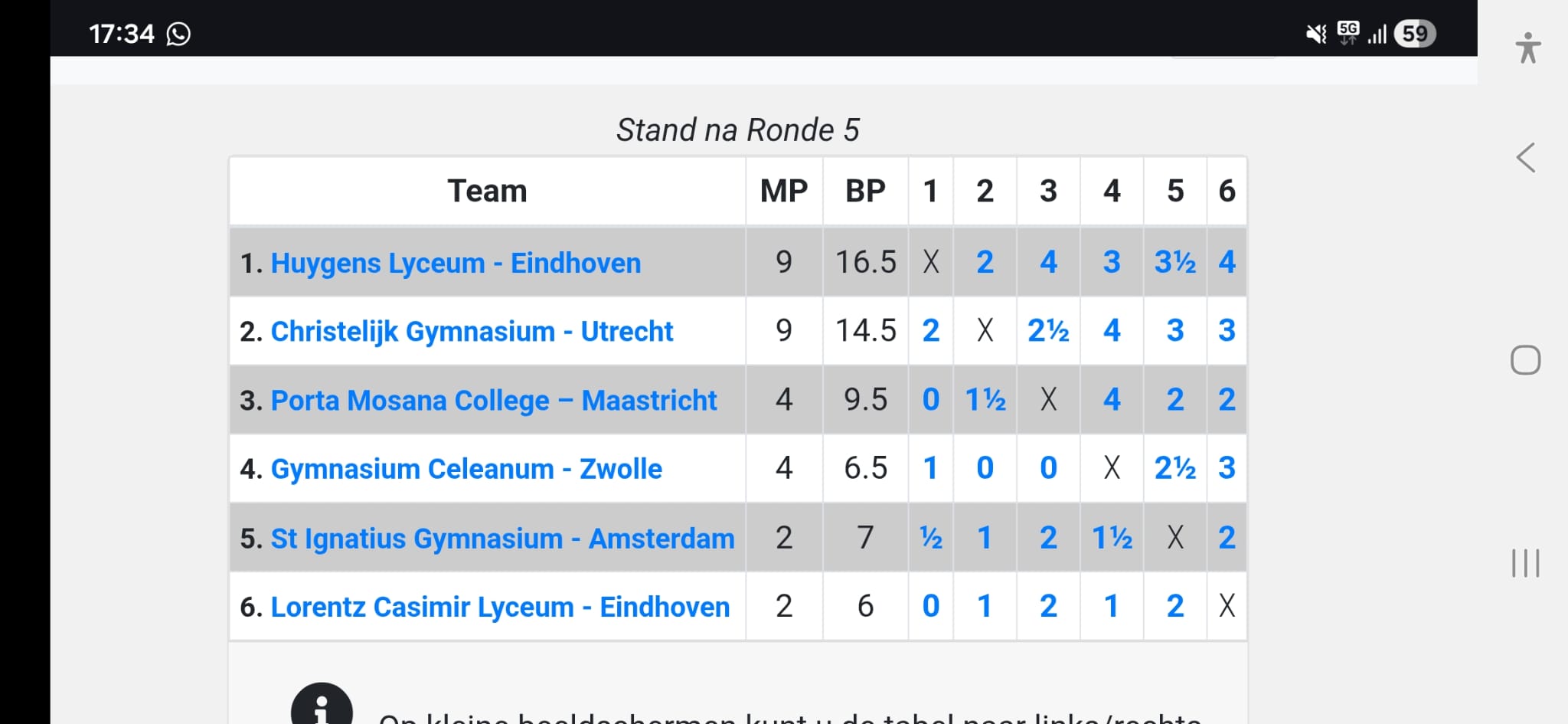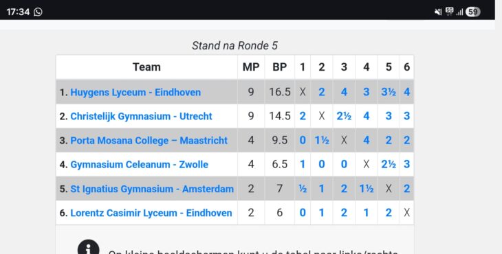 De vijf tegenstanders waren scholen uit Amsterdam, Utrecht, Maastricht en tweemaal Eindhoven. Die uit Amsterdam en Utrecht kenden we van het gymnasiale toernooi, de andere waren onbekend. Nog wat onder de indruk van de hele entourage en de zenuwen kwamen we er in de eerste ronde niet aan te pas tegen de school uit Maastricht. Geen bijzonder sterke tegenstander, maar we verloren kansloos met 0-4. Dat was een onverwachte tegenslag, maar we lieten ons niet kennen en sloegen in de volgende ronde terug met een 3-1 zege op een van de Eindhovense scholen. Utrecht en de andere Eindhovense school bleken daarna een maatje te groot, maar in de slotronde wisten we opnieuw van Amsterdam te winnen. Sterkste speler aan onze kant was Rana met 2,5 punt uit vier partijen.