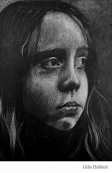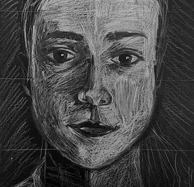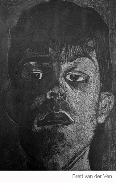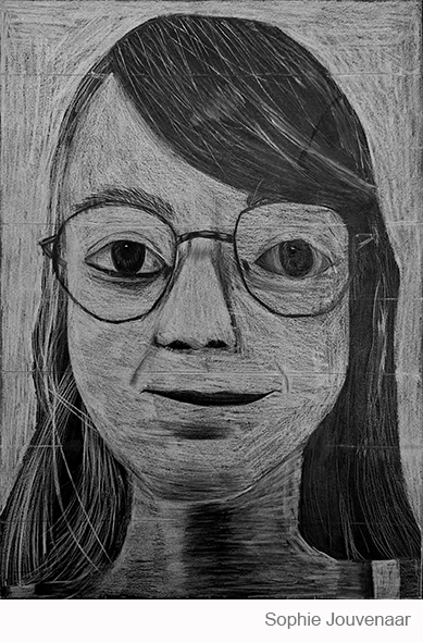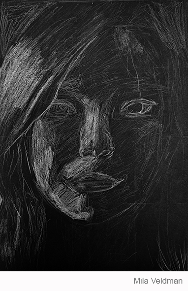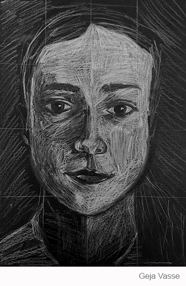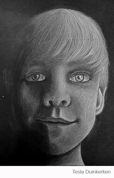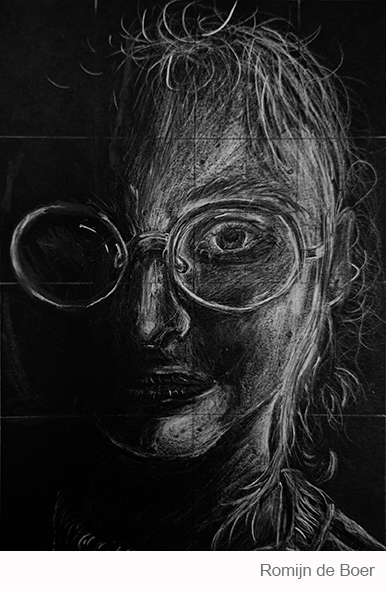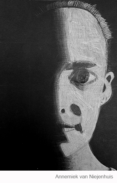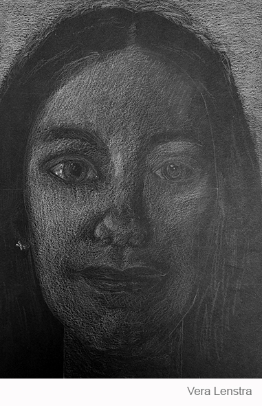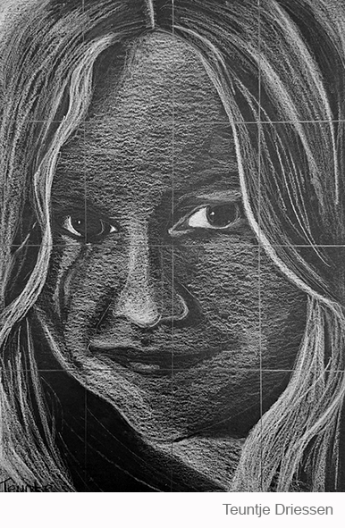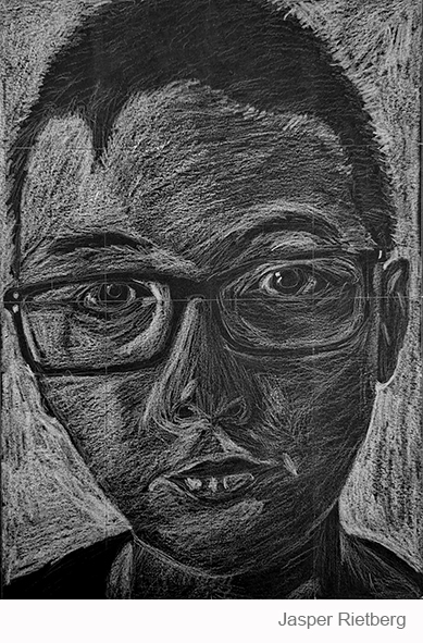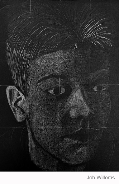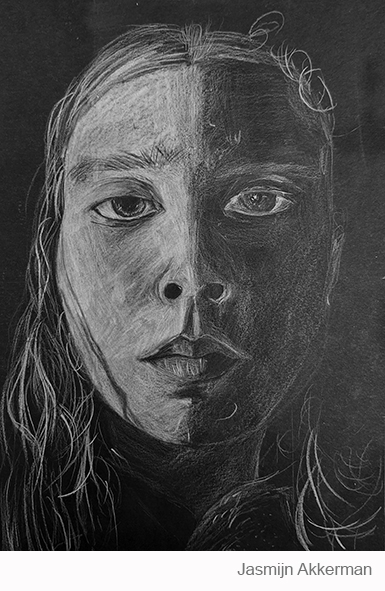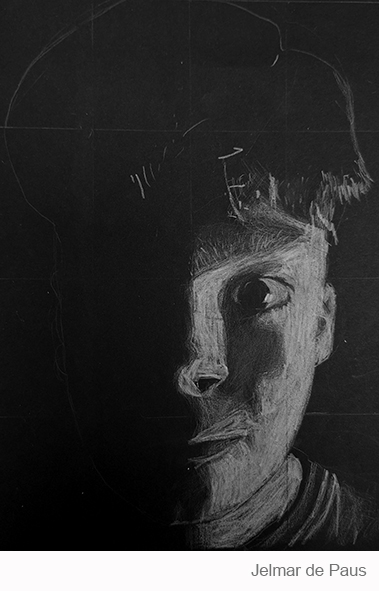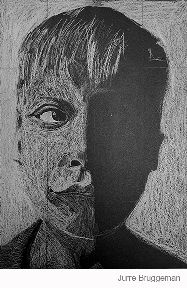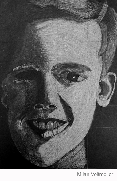Aan de hand van een foto van zichzelf hebben de leerlingen een zelfportret gemaakt met wit potlood op zwart papier. Het was dus niet een kwestie van ogen, neuzen en een mond tekenen, maar vooral van goed kijken wat je werkelijk ziet: zo objectief mogelijk. En dan was één oog soms al genoeg voor de suggestie van twee.