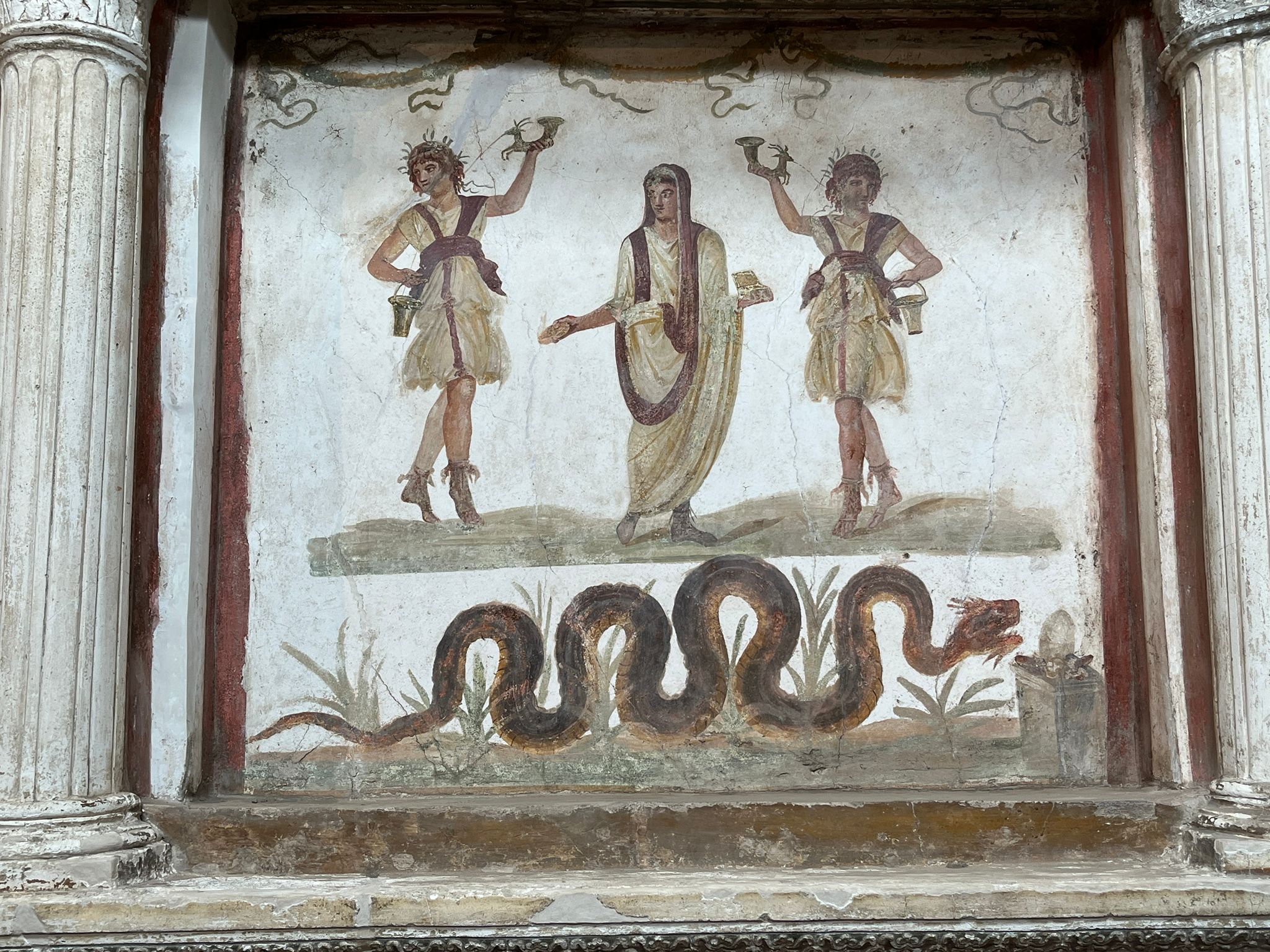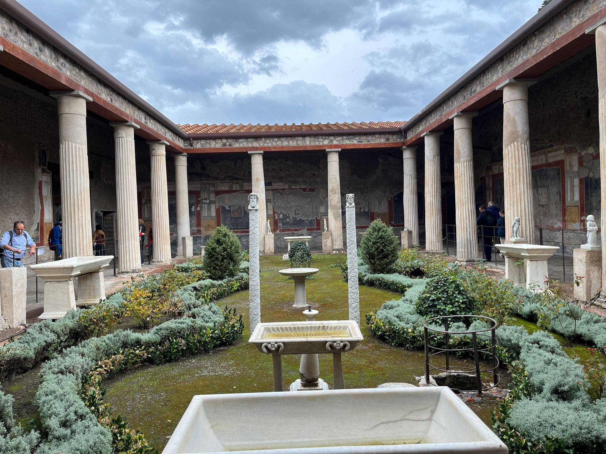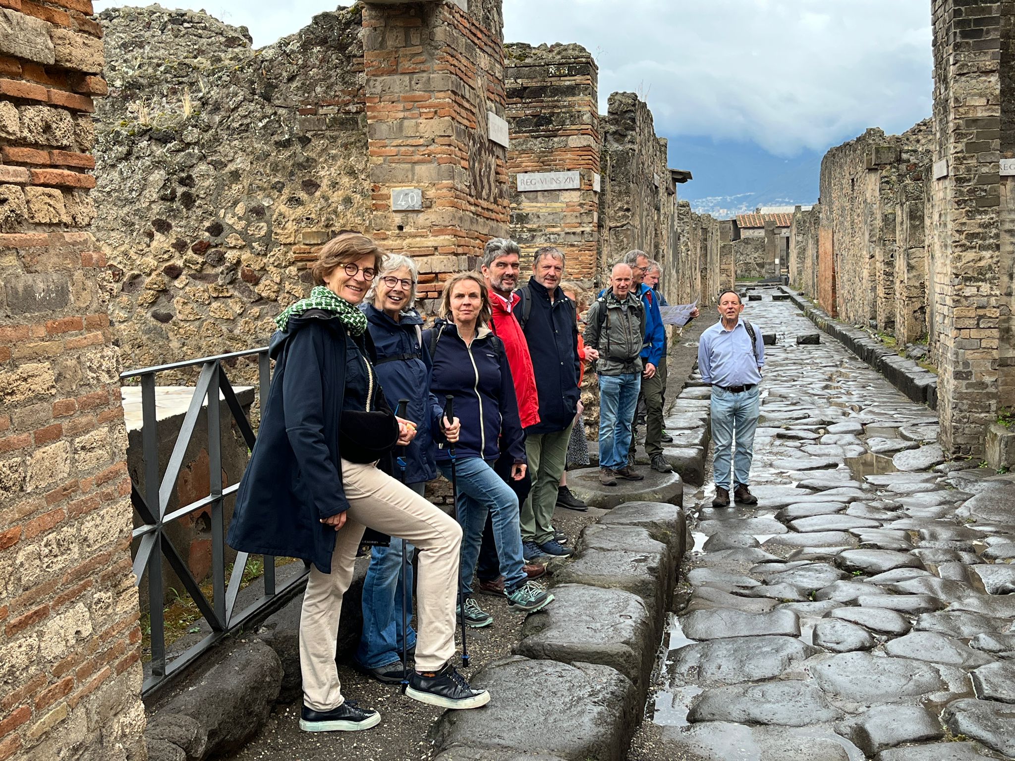 De fantastische Italiaanse hogesnelheidslijn maakte een dagexcursie naar Pompeï tot een ontspannen reis. In Pompeï kregen we een goed beeld van het leven in een antieke Romeinse stad in de provincie met haar theaters, badhuizen, heiligdommen, fora, pakhuizen, werkplaatsen, thermopolia (een soort fastfoodzaken), herbergen en woonhuizen in alle soorten en maten.