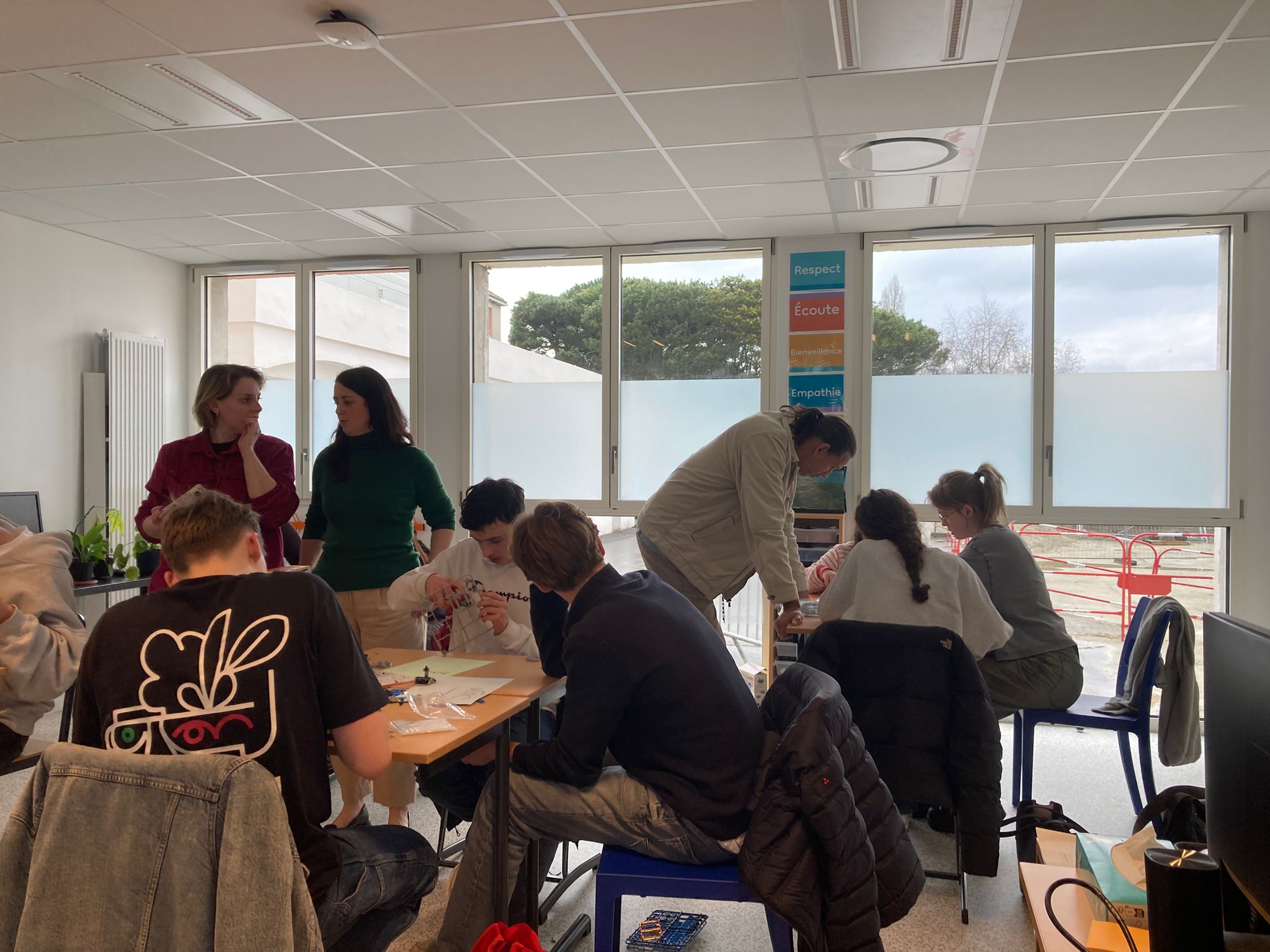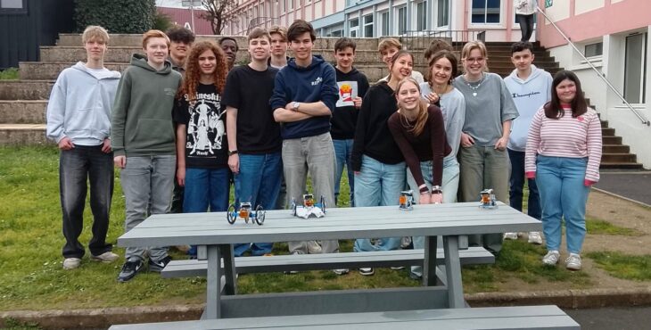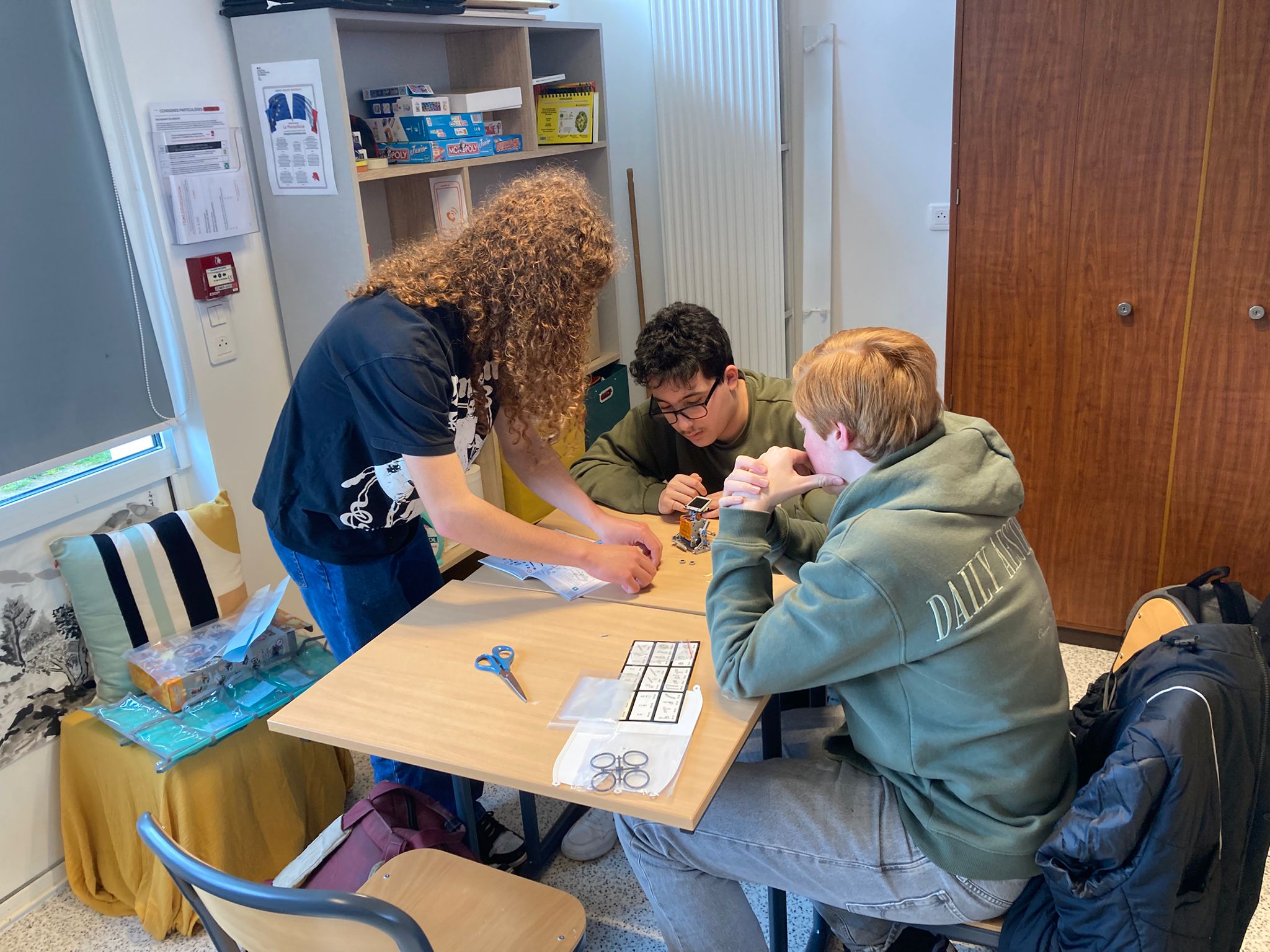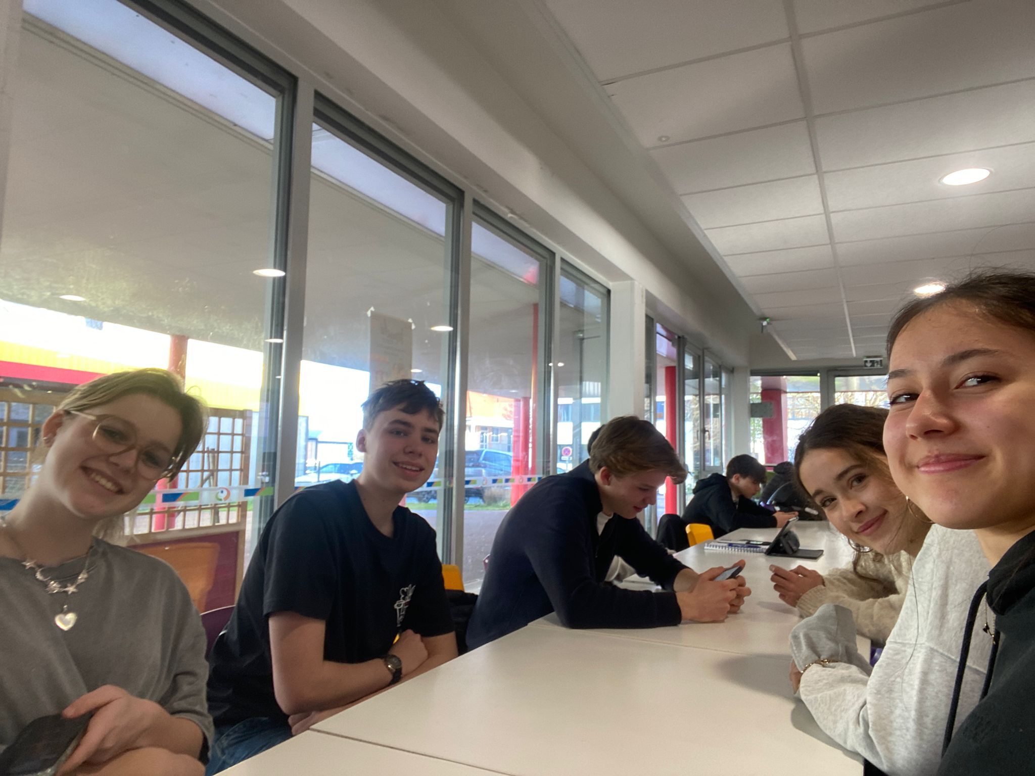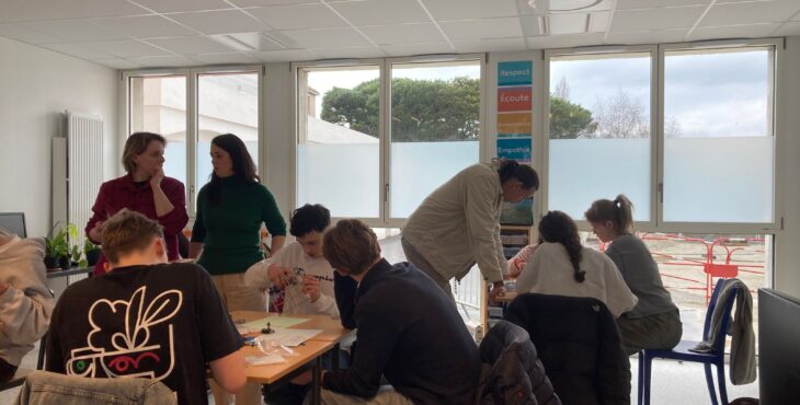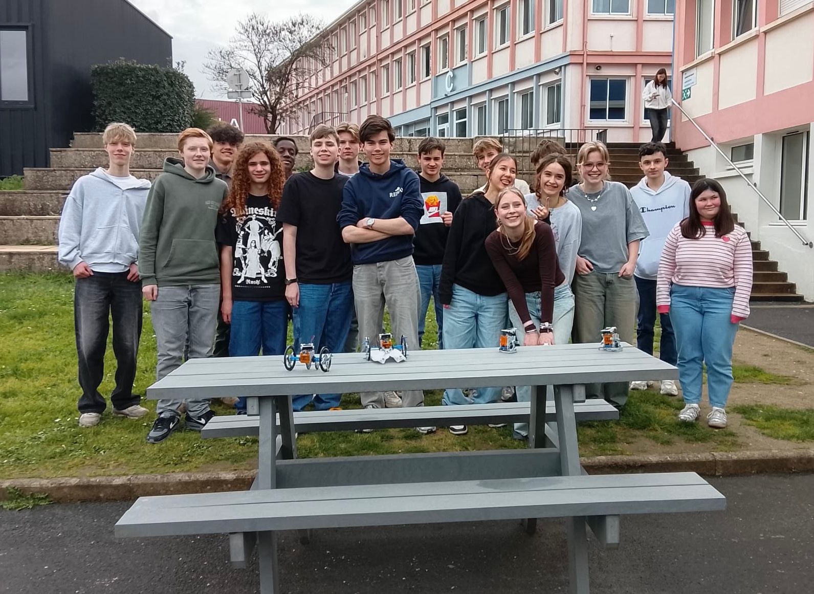 Vandaag gingen we meelopen met de lessen van onze uitwisselingsstudenten. We gingen allemaal om 9 uur naar school en sommige mensen konden direct de lessen volgen terwijl anderen moesten wachten omdat hun studenten een toets hadden. Het ging afwisselend door met wel of geen les van 9 tot 12 uur omdat de studenten ook uitval hadden. De ene les was lastiger dan de andere, zo waren er lessen Engels waar best aan mee te doen was, maar ook normale vakken waar de docenten Frans spraken en die dus lastig te volgen waren. In de les Frans gaf de docent ons een hele lastige woordzoeker en in de wiskundeles moesten we wat opdrachten maken. Hierna gingen we lunchen, sommigen in een van de restauranten waar je voor moet reserveren, sommige in het grote restaurant. Na de lunch verzamelden we met z’n allen om naar een workshop te gaan. Hier moesten we proberen om samen met kinderen die een leerbeperking hebben een robot te bouwen. We moesten hierbij trachtend om te communiceren met hen, wat lastig was, omdat zij bijna geen Engels konden en wij niet geweldig Frans. Het is uiteindelijk iedereen gelukt om een robotje te maken en deze gingen we dan ook uittesten. De robots werkten op zonne energie, wat het lastig maakte omdat het bewolkt was vandaag. Bij één ging het de hele tijd draaien en sommige anderen hadden wat dingetjes verkeerd dus werkte het niet. Na de workshop hadden we nog een paar uur vrije tijd, die iedereen dus zelf kon invullen. Sommige mensen gingen naar het Hellfest terrein in Clisson en sommige deden nog dingen met vrienden. Het was een hele leuke dag.