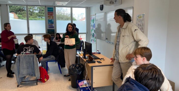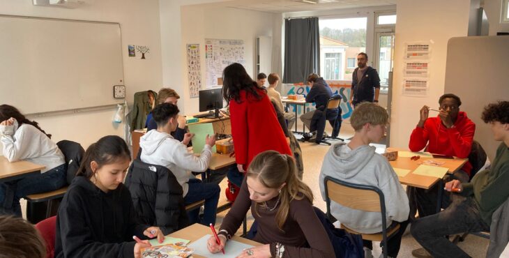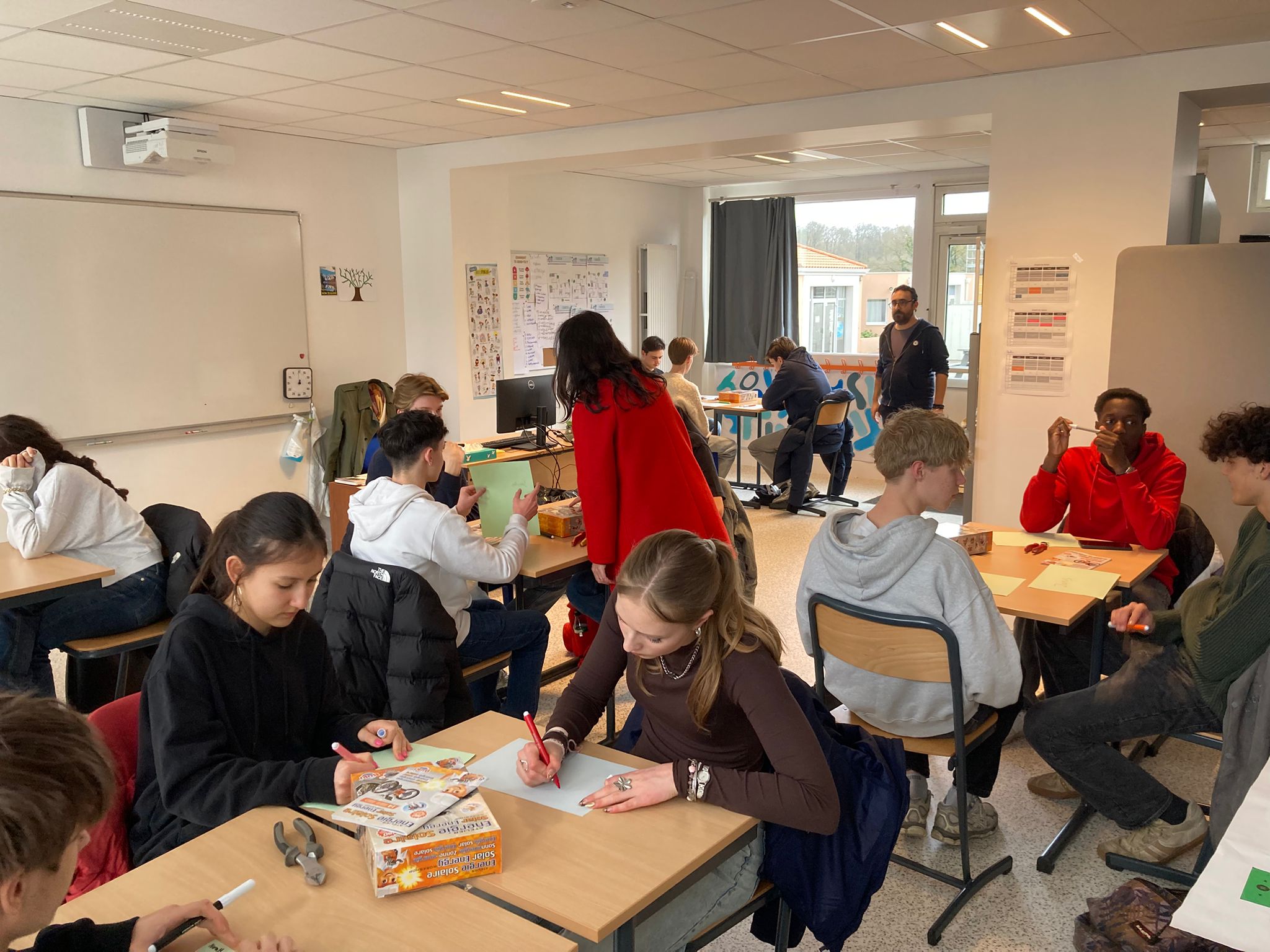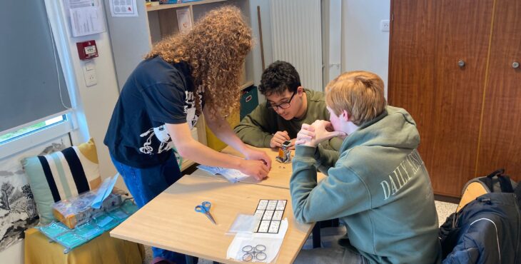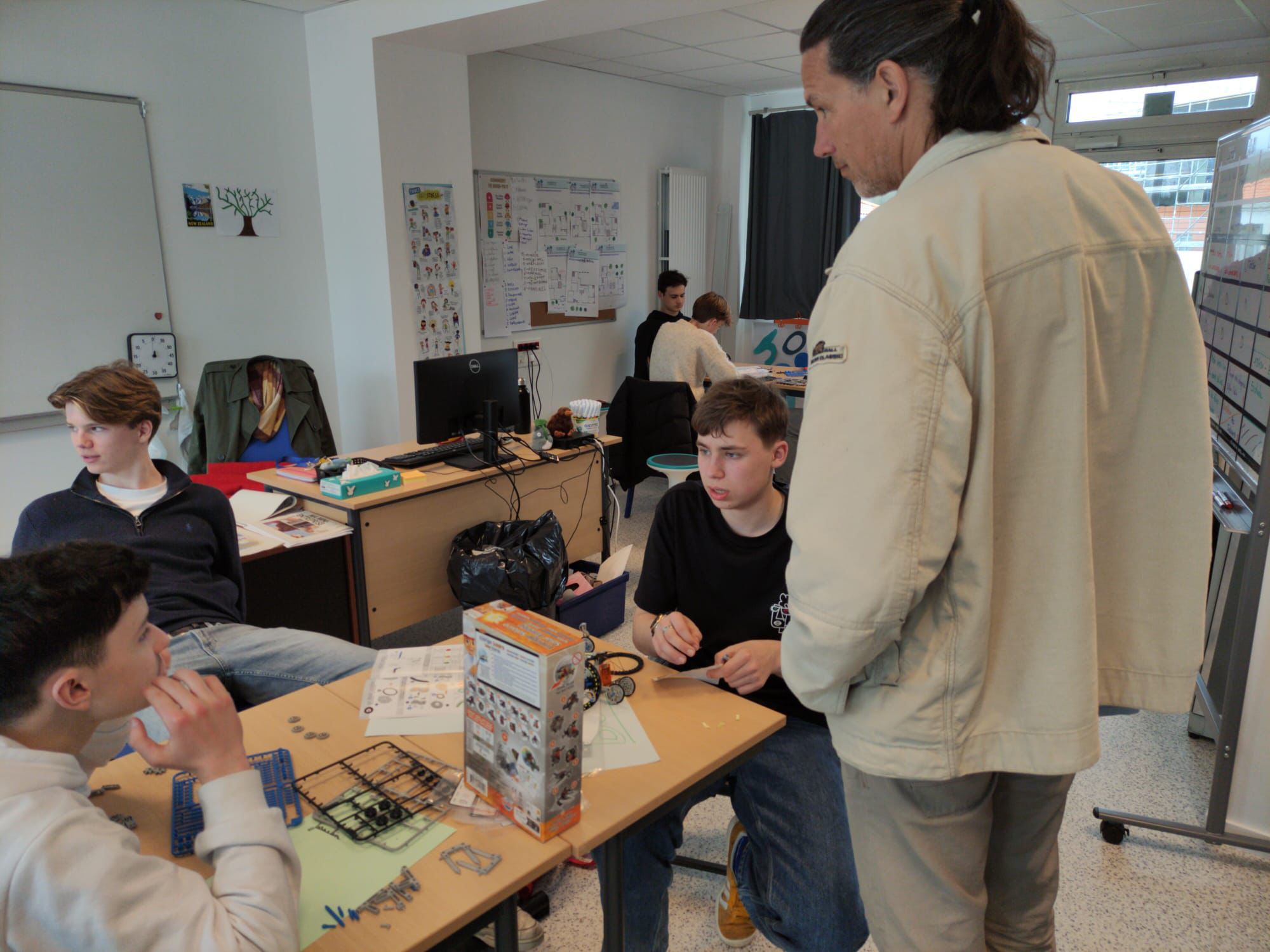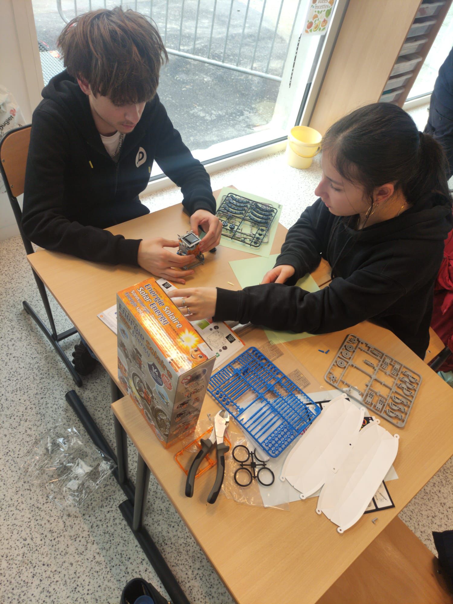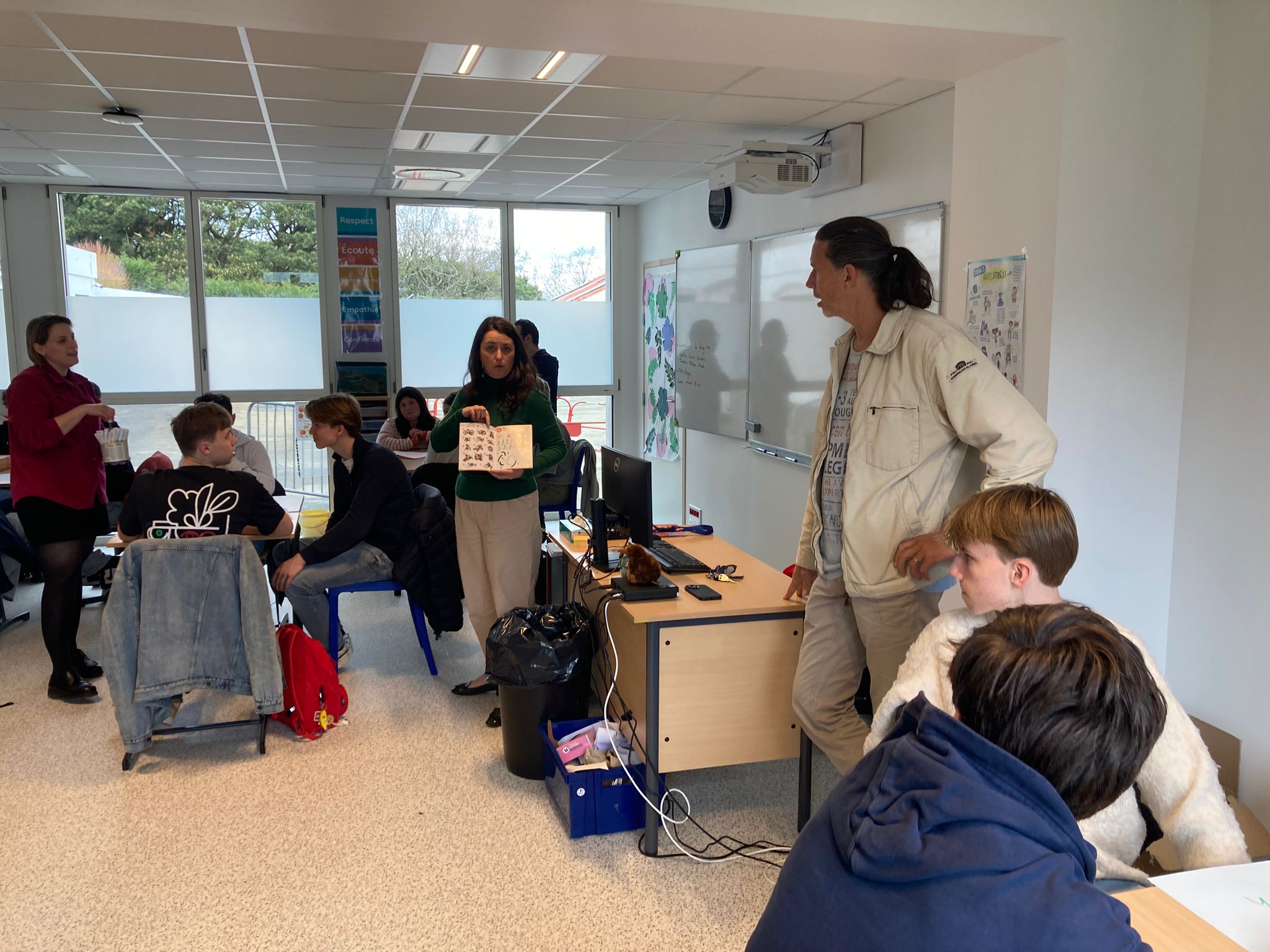 Vandaag gingen we meelopen met de lessen van onze uitwisselingsstudenten. We gingen allemaal om 9 uur naar school en sommige mensen konden direct de lessen volgen terwijl anderen moesten wachten omdat hun studenten een toets hadden. Het ging afwisselend door met wel of geen les van 9 tot 12 uur omdat de studenten ook uitval hadden. De ene les was lastiger dan de andere, zo waren er lessen Engels waar best aan mee te doen was, maar ook normale vakken waar de docenten Frans spraken en die dus lastig te volgen waren. In de les Frans gaf de docent ons een hele lastige woordzoeker en in de wiskundeles moesten we wat opdrachten maken. Hierna gingen we lunchen, sommigen in een van de restauranten waar je voor moet reserveren, sommige in het grote restaurant. Na de lunch verzamelden we met z’n allen om naar een workshop te gaan. Hier moesten we proberen om samen met kinderen die een leerbeperking hebben een robot te bouwen. We moesten hierbij trachtend om te communiceren met hen, wat lastig was, omdat zij bijna geen Engels konden en wij niet geweldig Frans. Het is uiteindelijk iedereen gelukt om een robotje te maken en deze gingen we dan ook uittesten. De robots werkten op zonne energie, wat het lastig maakte omdat het bewolkt was vandaag. Bij één ging het de hele tijd draaien en sommige anderen hadden wat dingetjes verkeerd dus werkte het niet. Na de workshop hadden we nog een paar uur vrije tijd, die iedereen dus zelf kon invullen. Sommige mensen gingen naar het Hellfest terrein in Clisson en sommige deden nog dingen met vrienden. Het was een hele leuke dag.