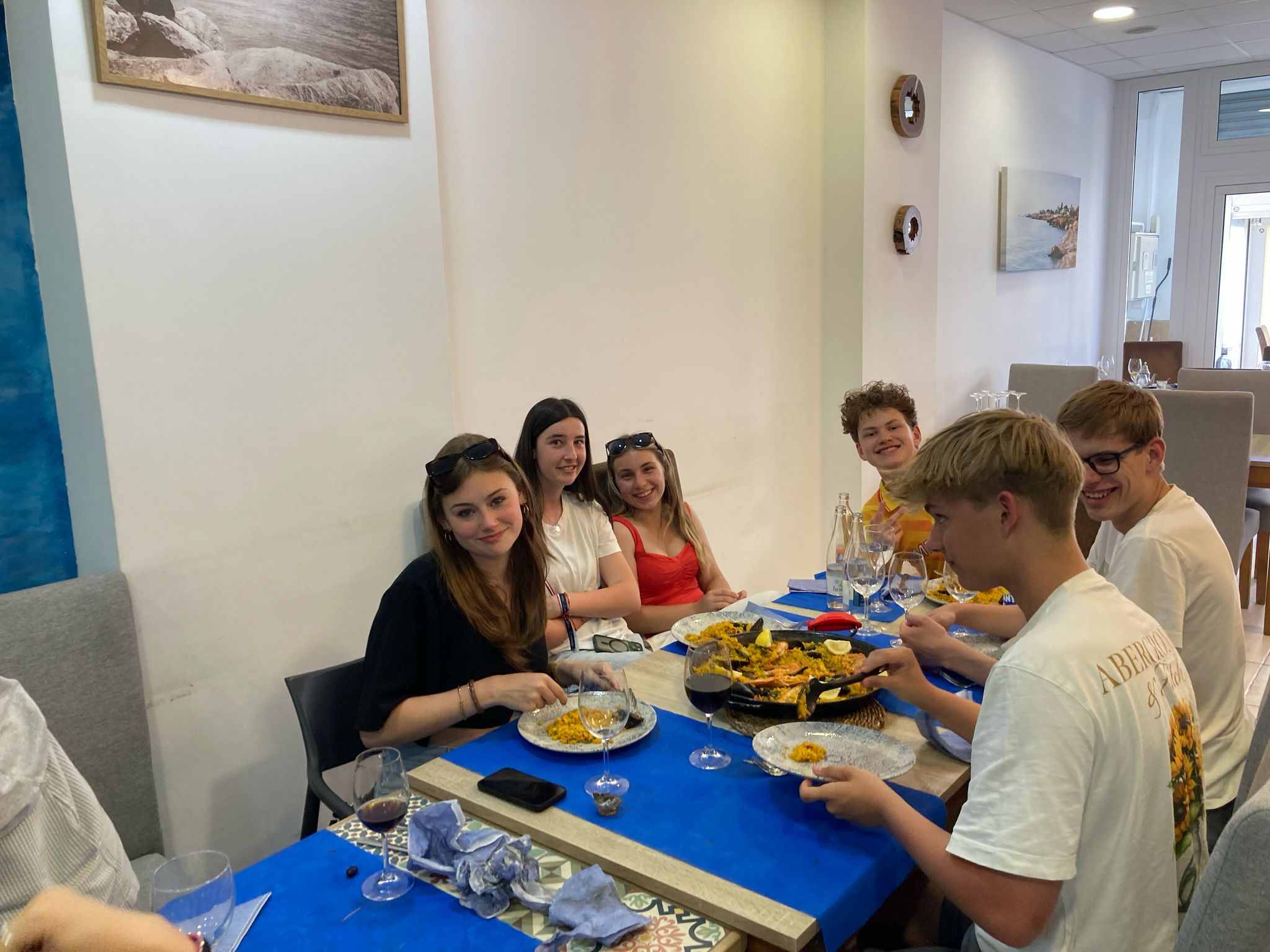 Toen kwam de lunch: paella, mosselen en garnalen. Allemaal gezamenlijk met de uitwisseling leerlingen, supergezellig. Op verzoek van meneer Bouwhuis werd Nightboat to Caïro gedraaid door wederom Ferre. Meneer Bouwhuis gaat namelijk zaterdag naar een concert van een ska-band.