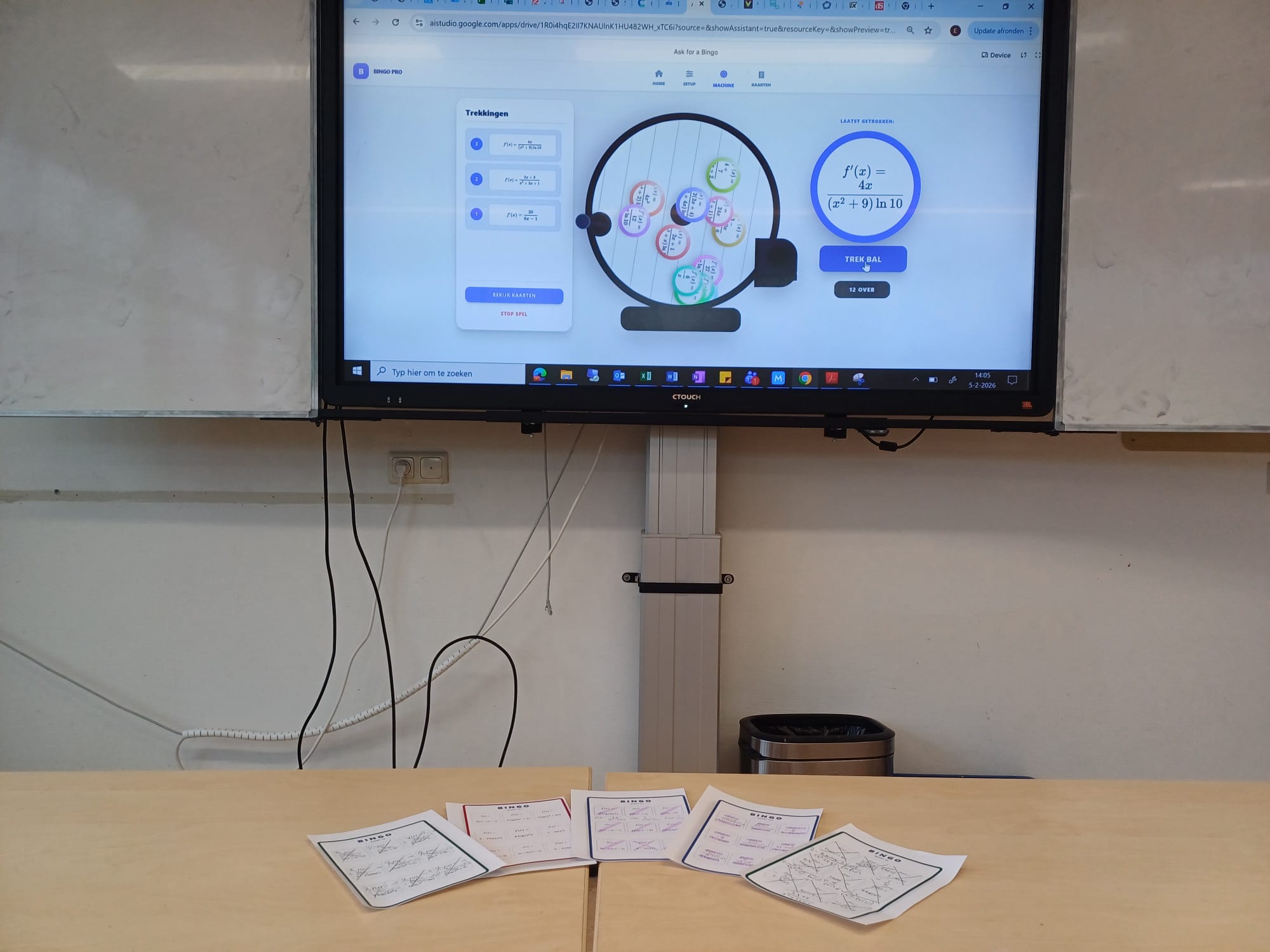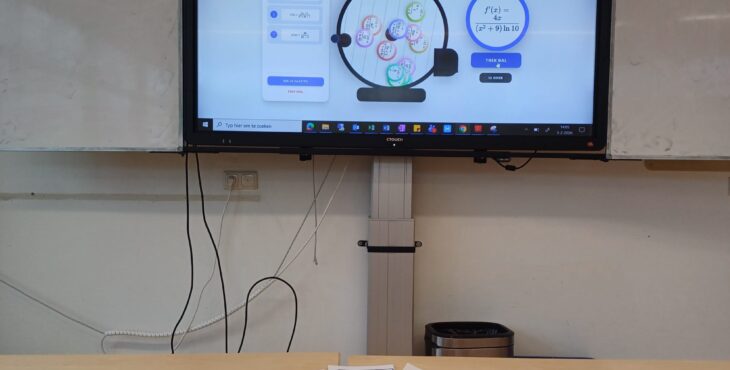 Op de Bingokaart stonden 9 functies. De leerlingen kregen ongeveer 15 minuten om deze te differentiëren. Vervolgens werd het rad gedraaid en rolden er ballen met een afgeleide functie daarop afgebeeld uit het rad. De kunst was dus om te kijken of de afgebeelde afgeleide overeenkwam met de afgeleide die ze zelf gevonden hadden. Uiteraard kon je soms ook gokken want als je niet zelf de afgeleide had kunnen vinden herken je hem wellicht wel als deze in beeld verschijnt.
