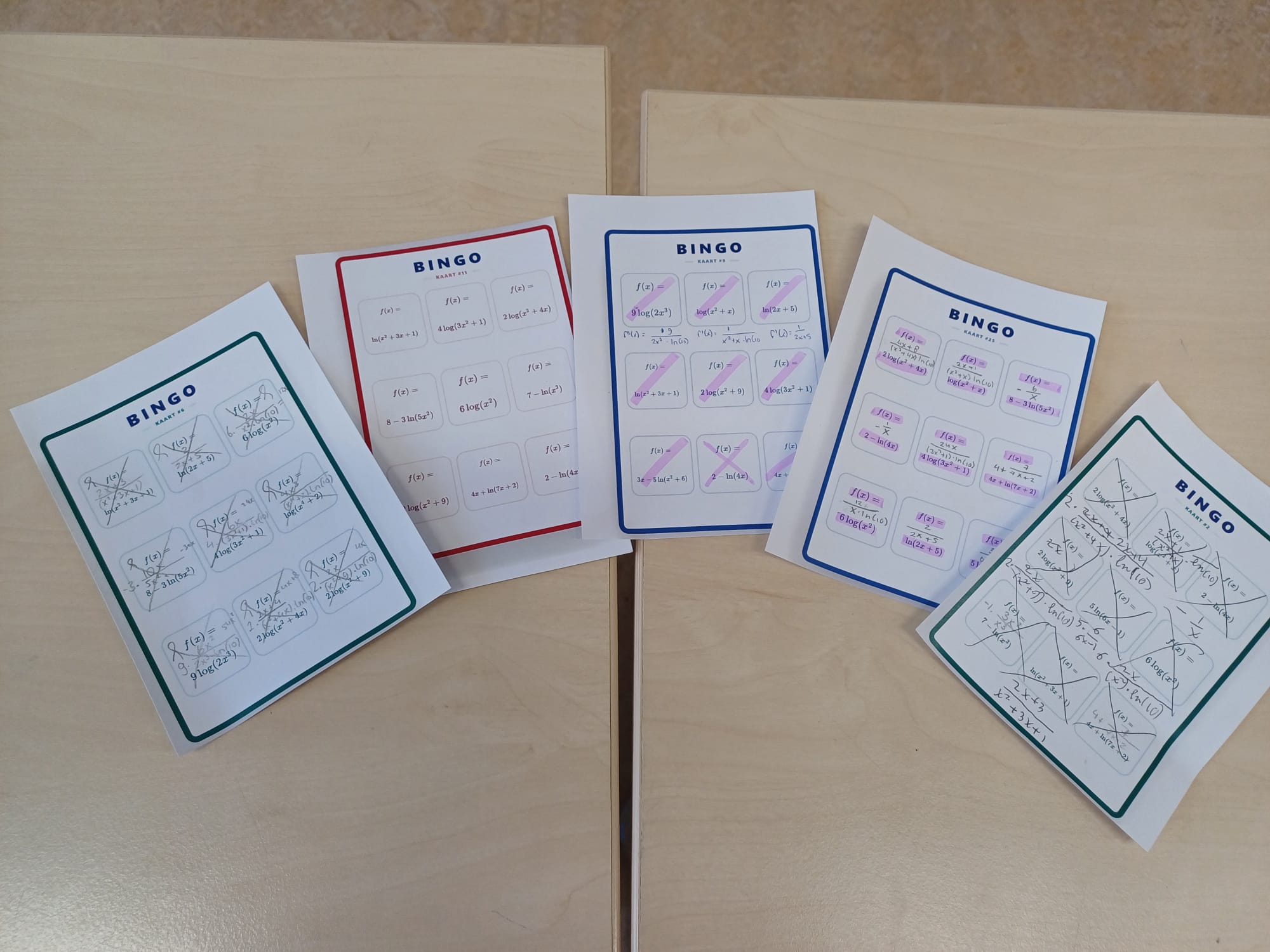 Even snel wat woordjes overhoren of bepaalde begrippen/vaardigheden op een speelse wijze laten oefenen via een Bingokaart. Klas 6 wiskunde A oefende zo met het differentiëren van logaritmische functies.